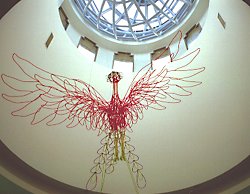 2mはある巨大な火の鳥のモビール。上方にはガラスの地球が見える。